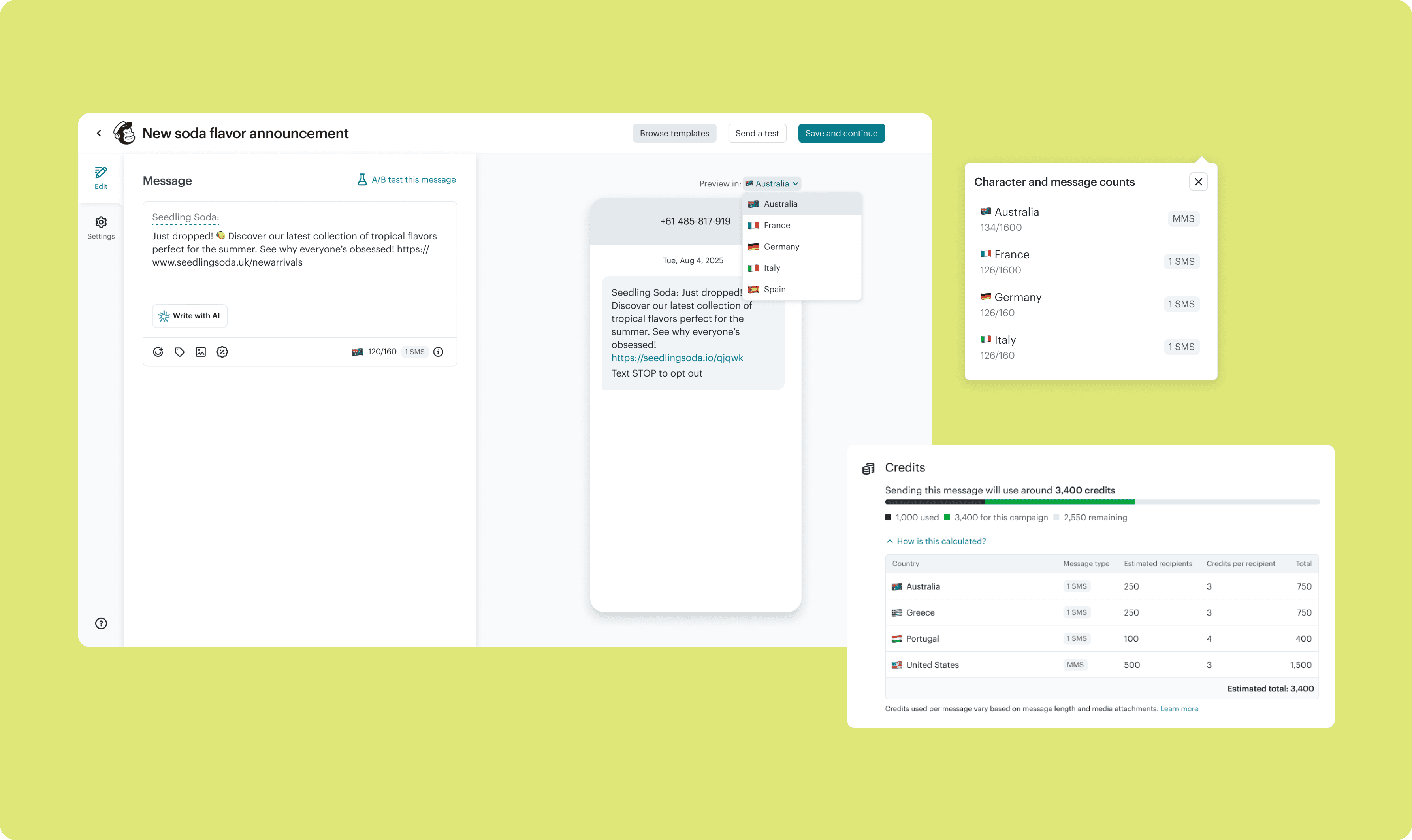Because SMS capabilities and compliance vary by country, customers needed clear visibility into how their message would look across regions. The experience should help users feel confident in what they’re sending before they send it.