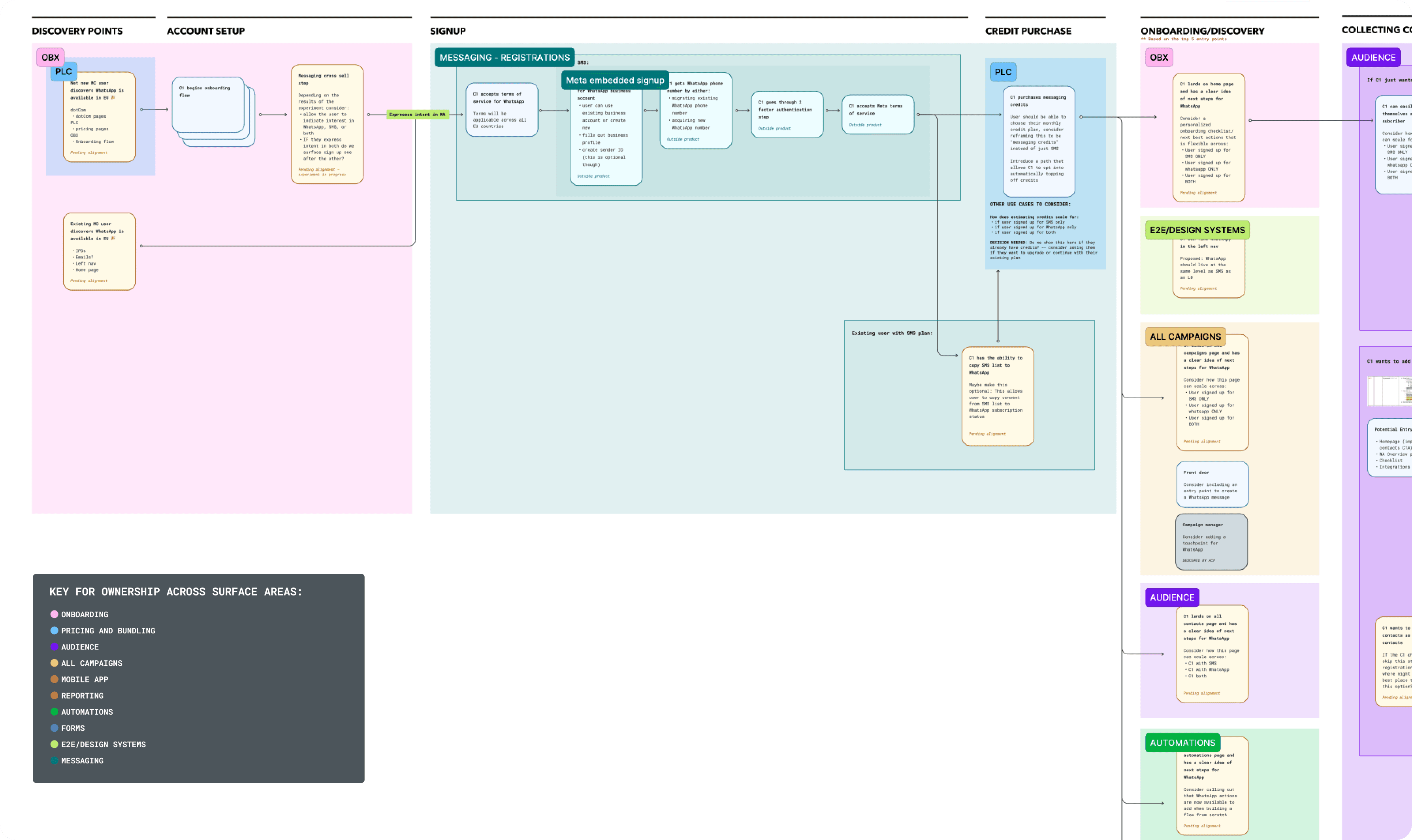 To support this, I paired with another designer to create a low-fidelity end-to-end journey map that visualized the full SMS experience from onboarding to creation to delivery.