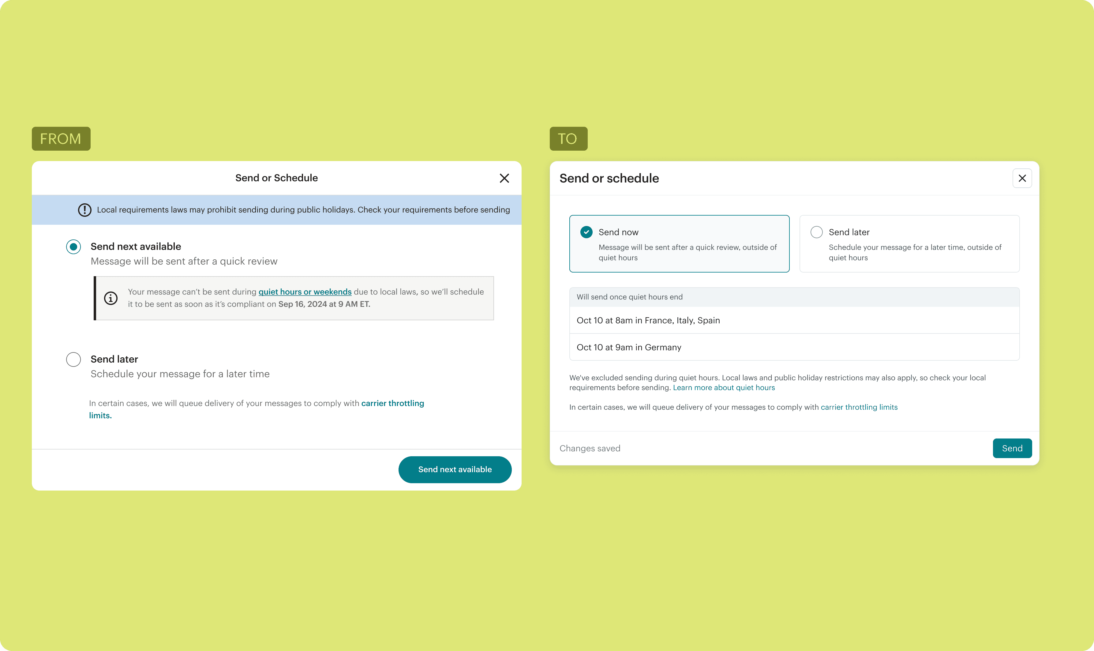 Differences in cost and quiet hours meant that delivery of the message could vary significantly by country. The product needed to clearly communicate when messages would be sent and how long it might take.