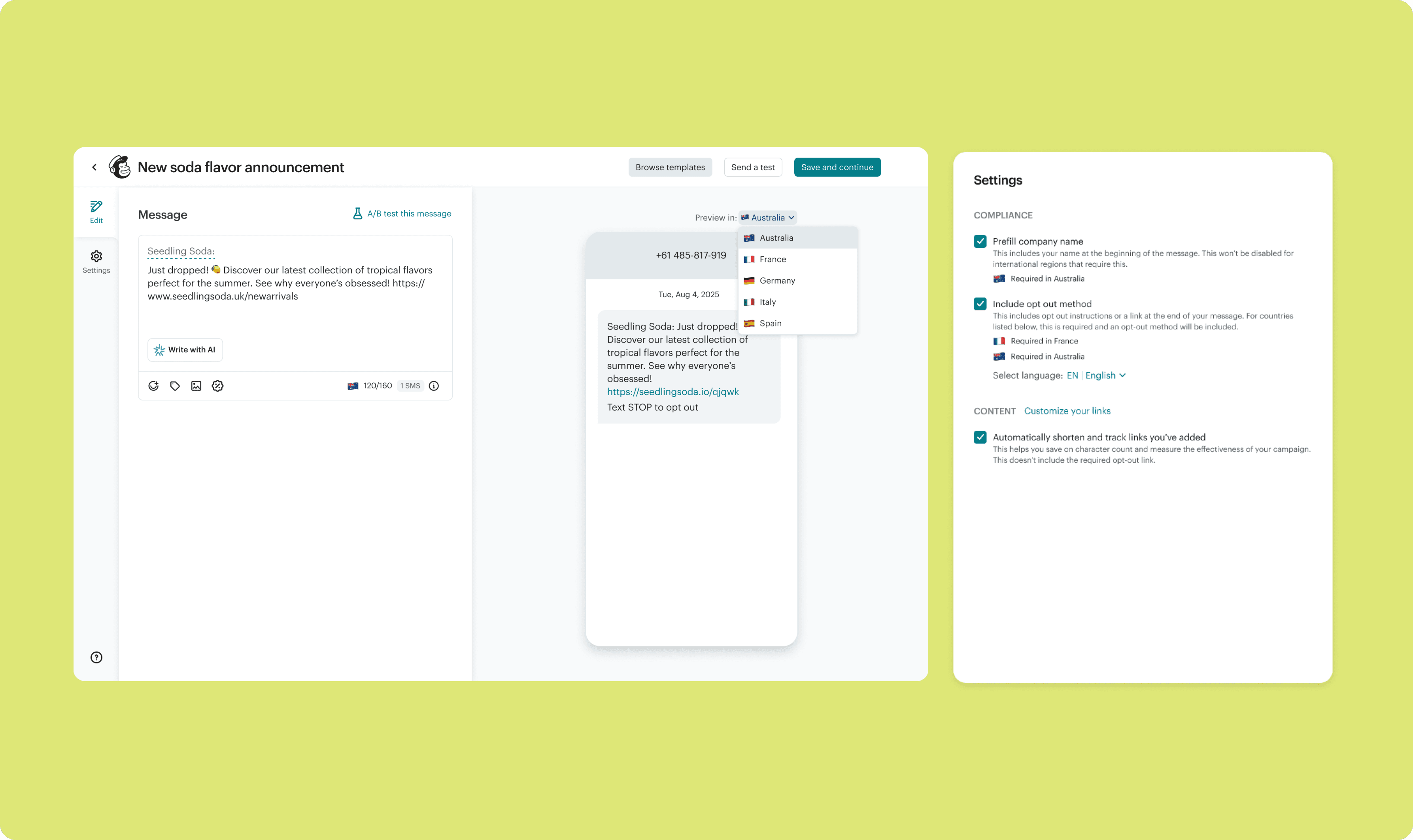 As the lead product designer on this effort, I scaled our initial single-country experience to support sending SMS marketing messages across 12 countries spanning the US, Europe, and Australia. This work transformed our SMS offering from a localized feature into a global product, creating a foundation for future country expansions and unlocking more complex international messaging strategies for our customers.